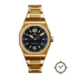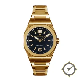A Luxury watch with a bold 44.5mm presence on the wrist, crafted from gold featuring a black dial with a unique matte-sunburst finish.