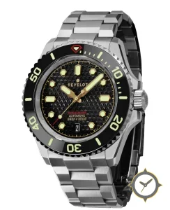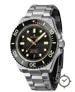A Dive watch with a vintage-inspired 37mm case, crafted from stainless steel featuring a black dial with a unique textured 3D geometric tessellation finish.