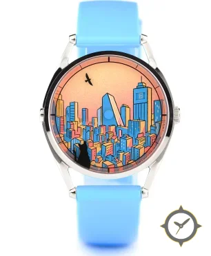 A Minimalist watch with a bold 42.5mm presence on the wrist, crafted from stainless steel featuring a orange dial with a unique printed illustration (matte) finish.