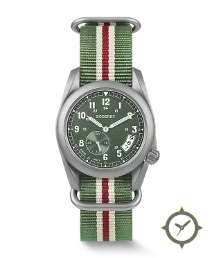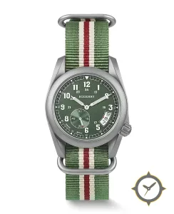 A Field watch with a vintage-inspired 36.5mm case, crafted from stainless steel featuring a green dial with a unique matte/grainy finish.