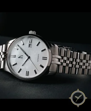 A Dress watch with a versatile 41mm case, that suits most wrists, crafted from stainless steel featuring a white dial with a unique mother-of-pearl finish.