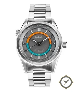 A GMT watch with a vintage-inspired 35mm case, crafted from stainless steel featuring a gray dial with a unique brushed finish and a true GMT complication for tracking a second time zone.