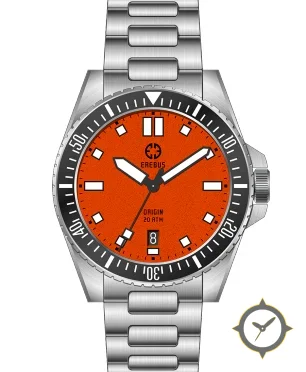 A Dive watch with a bold 43mm presence on the wrist, crafted from stainless steel featuring a orange dial with a unique textured/grain finish finish.