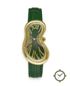 A Luxury watch with a vintage-inspired 30mm case, crafted from gold featuring a green dial with a unique lacquered finish.
