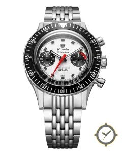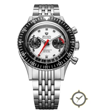 A Chronograph watch with a vintage-inspired 34mm case, crafted from stainless steel featuring a white dial with a unique matte white lacquer finish.