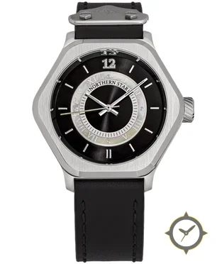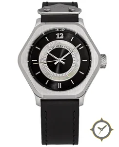 A Dress watch with a vintage-inspired 34mm case, crafted from stainless steel featuring a black dial with a unique sunburst center with mother-of-pearl inner ring finish.