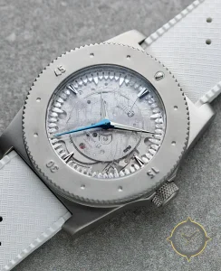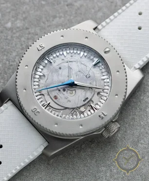 A Dive watch with a bold 46mm presence on the wrist, crafted from titanium featuring a silver dial with a unique transparent / openworked, showing movement finish.