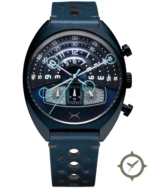 A Chronograph watch with a vintage-inspired 34.5mm case, crafted from stainless steel featuring a blue dial with a unique sunburst finish.