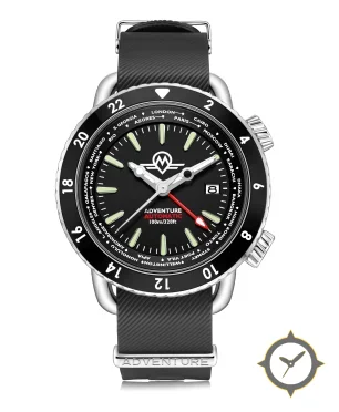 A GMT watch with a bold 44mm presence on the wrist, crafted from stainless steel featuring a black dial with a unique matte finish, perfect for the global traveler with its world-time function.