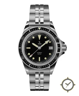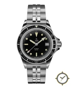 A Dive watch with a vintage-inspired 36.5mm case, crafted from stainless steel featuring a black dial with a unique glossy finish.