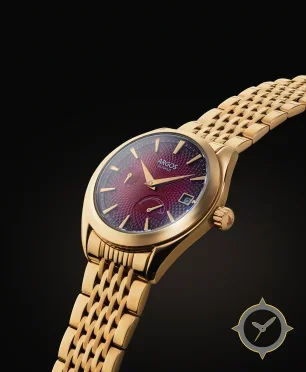 A Dress watch with a vintage-inspired 33.5mm case, crafted from gold featuring a purple dial with a unique guilloché (engine-turned) with a fumé/graduated finish finish and a helpful power reserve indicator.