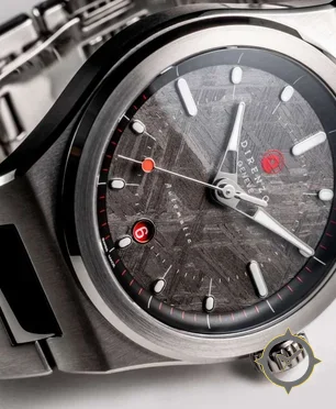 A Sports watch with a vintage-inspired 32mm case, crafted from stainless steel featuring a gray dial with a unique meteorite (Widmanstätten) texture, brushed/criss-cross pattern finish.