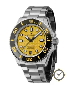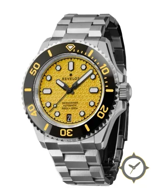 A Dive watch with a bold 42mm presence on the wrist, crafted from stainless steel featuring a yellow dial with a unique embossed geometric (triangular/hexagonal) texture finish.