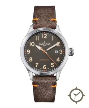 A Pilot watch with a bold 41.5mm presence on the wrist, crafted from stainless steel featuring a brown dial with a unique matte finish.