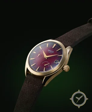 A Dress watch with a versatile 40.5mm case, that suits most wrists, crafted from gold featuring a crimson dial with a unique guilloché / textured finish with radial relief finish and a helpful power reserve indicator.