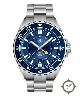 A GMT watch with a vintage-inspired 36.5mm case, crafted from stainless steel featuring a blue dial with a unique sunburst with horizontal ribbed lines finish and a true GMT complication for tracking a second time zone.