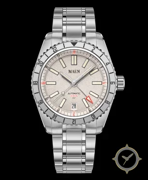 A GMT watch with a vintage-inspired 36mm case, crafted from stainless steel featuring a white dial with a unique sand-textured / grained finish and a true GMT complication for tracking a second time zone.