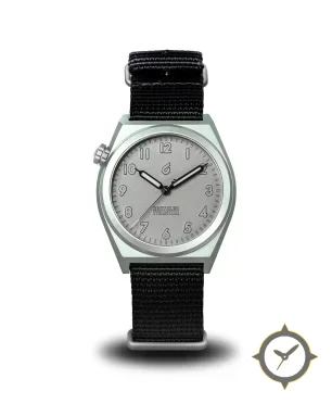 A Field watch with a vintage-inspired 36.5mm case, crafted from titanium featuring a silver dial with a unique matte finish.