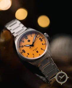 A Pilot watch with a bold 45.5mm presence on the wrist, crafted from stainless steel featuring a orange dial with a unique matte finish.