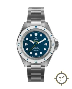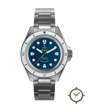 A Dive watch with a vintage-inspired 34.5mm case, crafted from stainless steel featuring a navy dial with a unique matte finish.