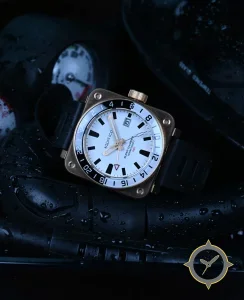 A Dive watch, crafted from bronze featuring a white dial with a unique matte finish and a true GMT complication for tracking a second time zone.