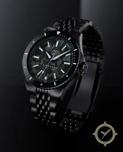 A Dive watch with a vintage-inspired 32mm case, crafted from stainless steel featuring a green dial with a unique three-dimensional geometric tessellated texture finish.