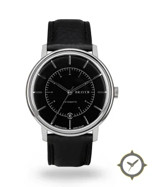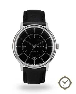 A Dress watch with a vintage-inspired 36.5mm case, crafted from stainless steel featuring a black dial with a unique matte finish.