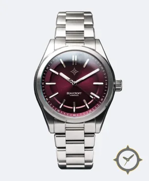 A Sports watch with a bold 41.5mm presence on the wrist, crafted from stainless steel featuring a crimson dial with a unique sunburst finish.