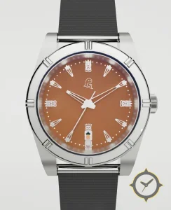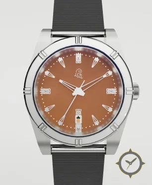 A Sports watch with a vintage-inspired 36mm case, crafted from stainless steel featuring a brown dial with a unique matte finish.