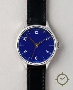 A Dress watch with a vintage-inspired 34mm case, crafted from stainless steel featuring a blue dial with a unique vitreous enamel finish.