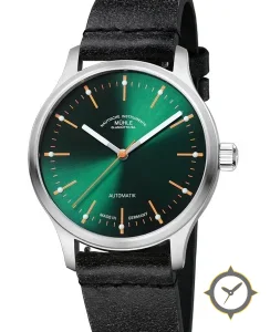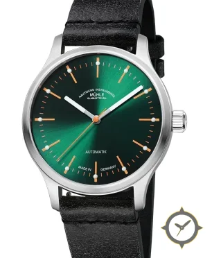 A Minimalist watch with a bold 42mm presence on the wrist, crafted from stainless steel featuring a green dial with a unique sunburst finish.