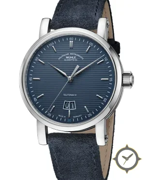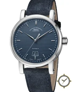 A Dress watch with a vintage-inspired 36mm case, crafted from stainless steel featuring a blue dial with a unique horizontal striped (railroad) texture finish.