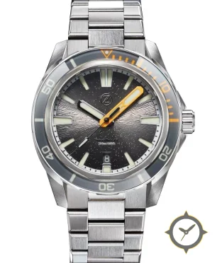 A Dive watch with a versatile 38.5mm case, that suits most wrists, crafted from stainless steel featuring a gray dial with a unique radial sunburst with speckled/meteorite-like finish finish.