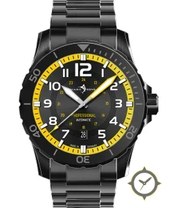 A Dive watch with a bold 49.5mm presence on the wrist, crafted from stainless steel featuring a black dial with a unique concentric rings (subtle guilloché) finish.