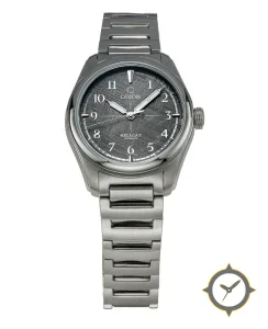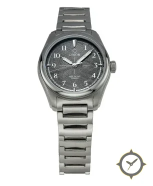 A Field watch with a vintage-inspired 29.5mm case, crafted from stainless steel featuring a gray dial with a unique meteorite (criss-cross Widmanstätten pattern) finish.