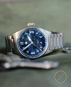A Pilot watch with a bold 45mm presence on the wrist, crafted from stainless steel featuring a blue dial with a unique textured / meteorite-like pattern finish.