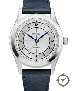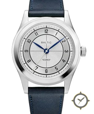 A Dress watch with a vintage-inspired 33mm case, crafted from stainless steel featuring a silver dial with a unique grained center with brushed circular ring finish.