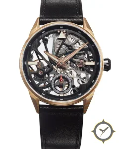 A Skeleton watch with a bold 42.5mm presence on the wrist, crafted from gold featuring a black dial with a unique open-worked / skeletonized with visible movement components finish.