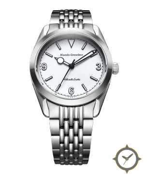 A Field watch with a versatile 38mm case, that suits most wrists, crafted from stainless steel featuring a white dial with a unique matte lacquer finish.
