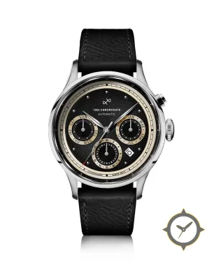 A Chronograph watch with a vintage-inspired 33mm case, crafted from stainless steel featuring a black dial with a unique grained / textured (sandwich-like) finish.