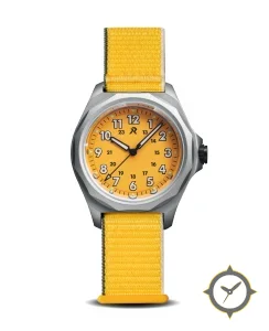 A Field watch with a bold 41.5mm presence on the wrist, crafted from stainless steel featuring a yellow dial with a unique matte finish.