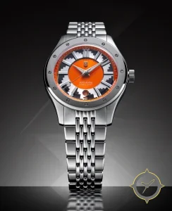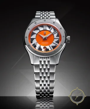A Sports watch with a versatile 40.5mm case, that suits most wrists, crafted from stainless steel featuring a orange dial with a unique matte finish.