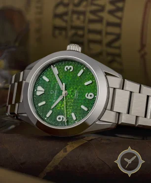 A Sports watch with a bold 45mm presence on the wrist, crafted from stainless steel featuring a green dial with a unique waffle finish.