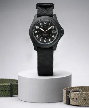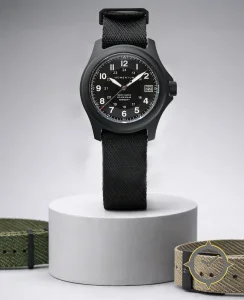 A Field watch with a bold 43mm presence on the wrist, crafted from stainless steel featuring a black dial with a unique matte finish.