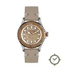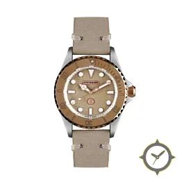 A Dive watch with a bold 43mm presence on the wrist, crafted from stainless steel featuring a brown dial with a unique matte (sand/beige finish) finish.