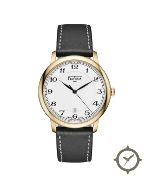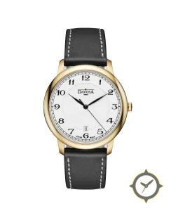 A Dress watch with a vintage-inspired 33.5mm case, crafted from gold featuring a white dial with a unique lacquer finish.