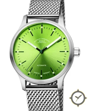 A Minimalist watch with a bold 45mm presence on the wrist, crafted from stainless steel featuring a green dial with a unique sunburst finish.