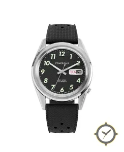 A Field watch with a bold 41.5mm presence on the wrist, crafted from stainless steel featuring a black dial with a unique textured (grained matte) finish.