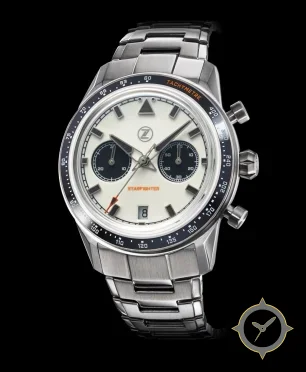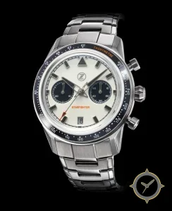 A Chronograph watch with a vintage-inspired 37mm case, crafted from stainless steel featuring a white dial with a unique matte lacquer finish.
