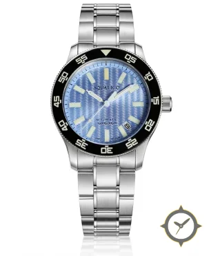 A Dive watch with a vintage-inspired 36.5mm case, crafted from stainless steel featuring a blue dial with a unique wavy/guilloché texture finish.